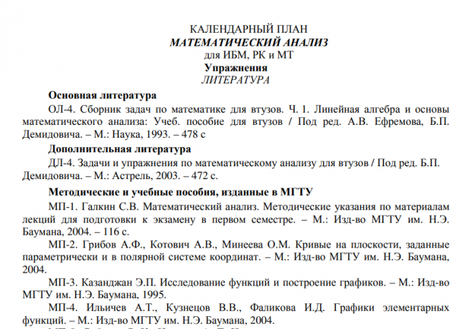 Для студентов МГТУ им. Н.Э.Баумана по предмету Математический анализКалендарный план. УпражненияКалендарный план. Упражнения