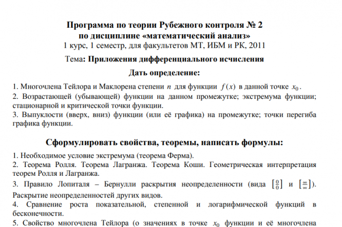 Вопросы/задания к контрольной работе: Программа по теории. РК №2 тема: «Приложения дифференциального исчисления»