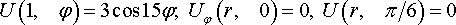 Найти решение уравнения Лапласа ΔU = 0 в круговом секторе 0 < r < 1, 0 < ϕ < α (r, ϕ – полярные координаты, α < 2π), на границе которого искомая функция удовлетворяет следующим условиям: