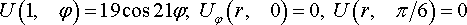 Найти решение уравнения Лапласа ΔU = 0 в круговом секторе 0 < r < 1, 0 < ϕ < α (r, ϕ – полярные координаты, α < 2π), на границе которого искомая функция удовлетворяет следующим условиям: