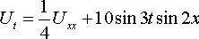 Решить смешанную задачу для данного неоднородного уравнения теплопроводности с нулевыми начальными и граничными условиями: U(x, 0) = 0, U(0, t) = 0, U(π, t) = 0