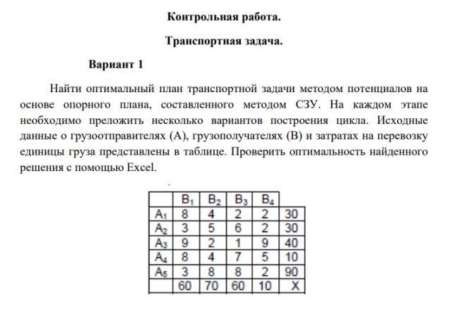 Контрольная работа. Транспортная задача. Вариант 1 Найти оптимальный план транспортной задачи методом потенциалов на основе опорного плана, составленного методом СЗУ. На каждом этапе необходимо преложить несколько вариантов построения цикла. Исходные данные о грузоотправителях (А), грузополучателях (В) и затратах на перевозку единицы груза представлены в таблице. Проверить оптимальность найденного решения с помощью Excel.