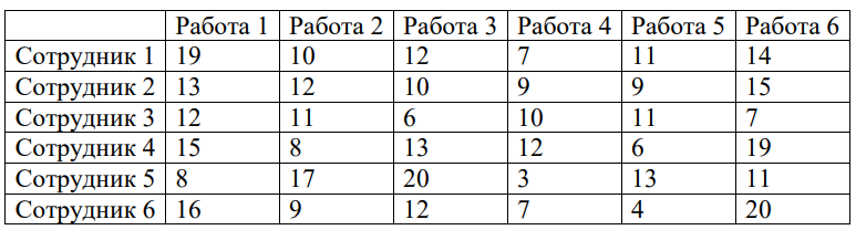 Построить математическую модель задачи о назначениях. Венгерским методом распределить сотрудников по должностям наилучшим образом, решить задачу на минимум. Проверить оптимальность найденного решения с помощью Excel.