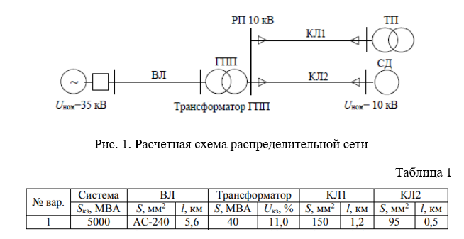 Для схемы электрической сети выше 1000 В (рис. 1) требуется составить схему замещения для расчета токов КЗ; определить сопротивления элементов схемы электроснабжения; наметить и обозначить на расчетной схеме и схеме замещения точки расчета токов КЗ; определить токи КЗ и составить «сводную ведомость токов КЗ». Кабельные линии к цеховой ТП и высоковольтному синхронному двигателю (СД) выполнены кабелями с бумажной поясной изоляцией. Среднее геометрическое расстояние между проводами воздушной линии электропередачи (ВЛ) принимаются любым.