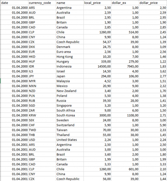 - изучить файл «BigmacPrice.csv », содержащий динамику изменения цены Биг-Мак в Мcdonald's в разных странах мира;
