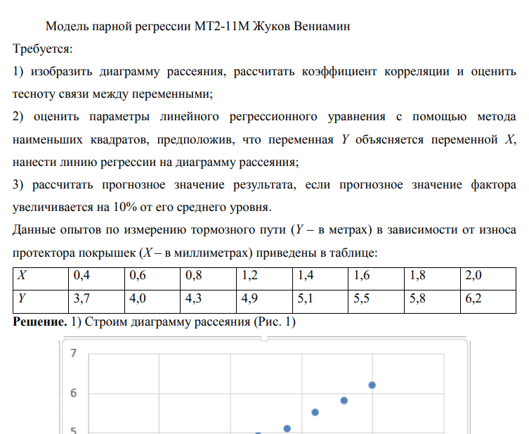 Требуется: 1) изобразить диаграмму рассеяния, рассчитать коэффициент корреляции и оценить тесноту связи между переменными; 2) оценить параметры линейного регрессионного уравнения с помощью метода наименьших квадратов, предположив, что переменная Y объясняется переменной X, нанести линию регрессии на диаграмму рассеяния; 3) рассчитать прогнозное значение результата, если прогнозное значение фактора увеличивается на 10% от его среднего уровня. Данные опытов по измерению тормозного пути (Y – в метрах) в зависимости от износа протектора покрышек (X – в миллиметрах) приведены в таблице: