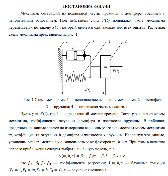 Часто в ходе решения различных практических задач возникает необходимость обработки экспериментальных данных и выявления законов и зависимостей, относящихся к изучаемому техническому объекту. В таком случае технический объект представляют как систему, имеющую определенное количество входов и выходов, и выделяют входные контролируемые (изменяемые), входные неконтролируемые (неизменяемые) и выходные параметры. Затем с помощью методов математической статистики находят взаимосвязи между факторами и откликом этой системы и представляют в виде математических выражений, то есть создают математическую модель исследуемого объекта. После этого полученная модель проверяется на адекватность и работоспособность, дается заключение о пригодности полученной модели. В данной работе рассматривается построение линейной регрессионной модели механизма и выполняется ее проверка