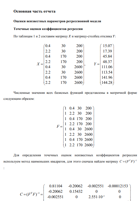 В данной работе для взятой регрессионной модели определены коэффициенты регрессии, определена их значимость. Проведена оценка адекватности и работоспособности модели по имеющимся экспериментальным данным. Проведение данного рода анализа позволяет определить, возможно ли применять данную регрессионную модель для описания поведения системы в контексте измеряемых входных и выходных параметров системы. При проведении расчетов использован математический пакет Matlab. Код программы представлен в приложении.
