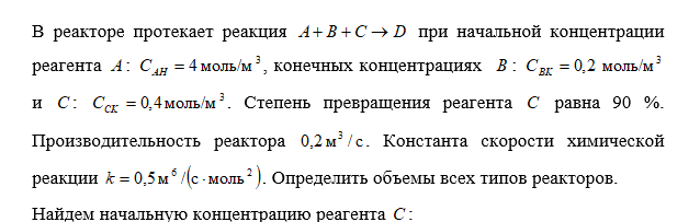 В реакторе протекает реакция при начальной концентрации реагента : , конечных концентрациях : и : . Степень превращения реагента равна 90 %. Производительность реактора . Константа скорости химической реакции . Определить объемы всех типов реакторов.