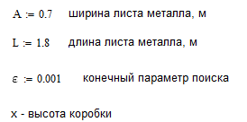 Бревно длиной в L м имеет форму конуса, диаметры оснований которого равны соответственно D и d м. Требуется автоматизировать процесс раскроя бревна для получения бруса квадратного поперечного сечения, ось которого совпадала бы с осью бревна и объем которого был бы наибольшим. Каковы должны быть размеры бруса (длина бруса может отличаться от длины бревна!)? Принять e = 0,001.