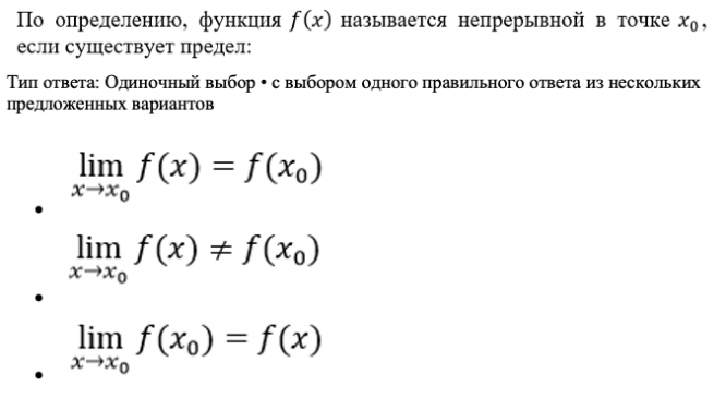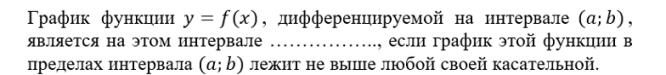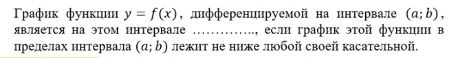 График функции y=f(x) дифференцируемой на интервале является на этом интервале (a;b) если график этой функции в пределах интервала лежит не выше любой своей касательной График функции y=f(x) дифференцируемой на интервале является на этом интервале (a;b) если график этой функции в пределах интервала лежит не ниже любой своей касательной Действительные числа, которые можно представить в виде отношения двух целых чисел называются Тип ответа: Одиночный выбор • с выбором одного правильного ответа из нескольких предложенных вариантов рациональные числа иррациональные числа действительные числа Действительные числа, которые нельзя представить в виде отношения двух целых чисел называются …………………..