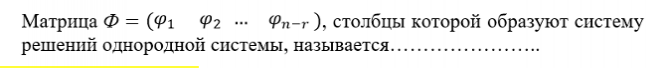 Матрица Ф = (Ф1, Ф2…Фn-r), столбцы которой образуют систему решений однородной системы, называется Матрица A порядка m×n называется …………….матрицей, если количество строк и столбцов совпадают: m=n. Матрица-столбец B = (b1,b2,bm), называется матрицей ….., а матрица столбец X = (x1,x2,xn) – матрицей неизвестных. Матрица, удовлетворяющая условию A=AT называется ……….. матрицей. Определите матрицу X, если известно, что: Определите правильный порядок решения системы линейных уравнений по формуле Крамера: Тип ответа: Сортировка 1 2 3 4 5 6 Определитель равен (-17) (-5) 23 17 Определить ранг матрицы A = 5 3 2 4 По определению, функция f(x) называется непрерывной в точке x0, если существует предел: Тип ответа: Одиночный выбор • с выбором одного правильного ответа из нескольких предложенных вариантов Порядком дифференциального уравнения является: наивысший порядок входящих в это уравнение производных низший порядок входящих в это уравнение производных средний порядок входящих в это уравнение производных Порядок входящих в уравнение производных: ограничен может быть различен зависит от условия задачи Предел отношения двух бесконечно малых функций равен пределу отношения их производных, если последний существует- это правило ………… При перестановке дух любых строк определитель матрицы Тип ответа: Одиночный выбор • с выбором одного правильного ответа из нескольких предложенных вариантов не изменится станет отрицательным увеличится меняет свой знак При умножении матрицы А = (1,3,3,4,2,5,0,6,1) на число к=3 получим: Тип ответа: Одиночный выбор • с выбором одного правильного ответа из нескольких предложенных вариантов Расположите в правильной последовательности действия при возведении матрицы в целую неотрицательную степень: Тип ответа: Сортировка 1 2 3 4 5 Расположите в правильной последовательности действия при умножении двух матриц: Тип ответа: Сортировка 1 записать матрицу А 2 записать матрицу В 3 проверить, чтобы количество столбцов в первой матрице, было равно количеству строк второй 4 записать результирующую матрицу С в общем виде 5 провести расчет элементов матрицы С 6 записать результирующую матрицу С Решите систему линейных уравнений Гаусса: (0;-2;1;0;2;1) (0;2;1;0;2;-1) (0;2;1;0;2;1) (0;2;-1;0;2;-1) Система, у которой количество уравнений совпадает с числом неизвестных (m=n) называется: кубической системой линейных уравнений квадратной системой линейных уравнений сложной системой линейных уравнений Совокупность некоторых элементов, объединенных каким-либо общим признаком называется ……………..