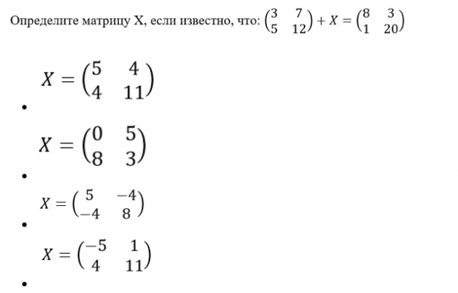 Для любой матрицы A существует ………… матрица -A такая, что A+(-A)=0. Если две группы совокупностей образуют третью, состоящую только из общих элементов заданных составляющих, это называется ………..множеств, обозначается значком ∩: C=A∩B Если две совокупности образуют третью, включающую элементы одной из заданных групп и не содержащую элементы второй, получается ………….. совокупностей, обозначается значком /: C=A/B Если линейная комбинация строк равна нулю тогда и только тогда, когда все коэффициенты равна нулю, т.е. строки е1, е2… называются Если функция f(x) определена в некоторой окрестности точки х0 и имеет в точке х0 производные всех порядков, то степенной ряд: Если элемент x принадлежит множеству X, то записывают: Тип ответа: Одиночный выбор • с выбором одного правильного ответа из нескольких предложенных вариантов x ∈ Х x / X x ∪ X Исследовать систему на совместимость система не совместна система совместна для решения не хватает данных Какое из свойств не является свойством обратной матрицы: Матрица А-1 называется…по отношению к матрице А, если при умножении этой матрицы на данную как справа, так и слева получается единичная.