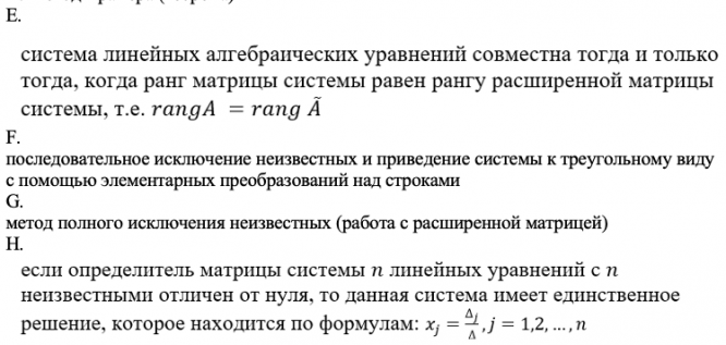 I. J. K. L. M. N. Установите соответствие методов решения систем линейных алгебраических уравнений (СЛАУ) и характеристик этих методов: Тип ответа: Сопоставление A.Теорема Кронекера–Капелли B. Метод Гаусса C.Метод Жордана–Гаусса D. Метод Крамера (теорема) E. F. последовательное исключение неизвестных и приведение системы к треугольному виду с помощью элементарных преобразований над строками G. метод полного исключения неизвестных (работа с расширенной матрицей) H. Установите соответствие методов решения систем линейных уравнений и их характеристик: Тип ответа: Сопоставление Метод Гаусса Обратный ход метода Гаусса Правило треугольников поочередное преобразование уравнений системы для последующего избавления от неизвестных переменных вычисление переменных неизвестных от последнего уравнения к первому произведение диагональных составляющих и произведения вершин двух треугольников уменьшаемой матрицы суммируются Установите соответствие понятий и их математических выражений: Тип ответа: Сопоставление A.Присоединенная матрица B.Вырожденная матрица C.Обратная матрица D.Определитель матрицы E.Минор матрицы F.
