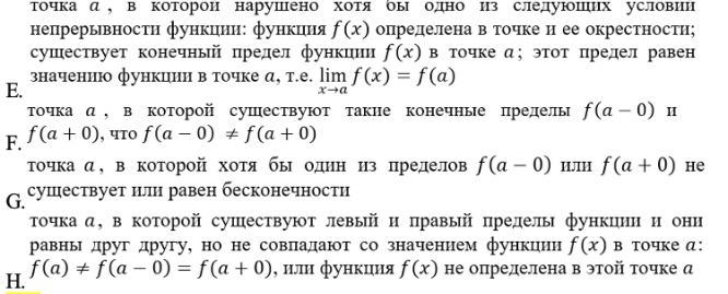 G. H. I. J. Установите соответствие точек разрыва и их определений: A.Точка разрыва функции B.Точка разрыва первого рода C.Точка разрыва второго рода D.Точка устранимого разрыва E. F. G. H. Установите соответствие функций и соответствующих графиков: Тип ответа: Сопоставление A.Дробно-линейная функция B.Квадратный трехчлен C.Показательная функция D.Логарифмическая функция E. F. G. H. Установить правильную последовательность схемы исследования функции на выпуклость, вогнутость: Тип ответа: Сортировка найти вторую производную функции найти точки, в которых вторая производная равна нулю или не существует исследовать знак производной слева и справа от каждой найденной точки Функция f(x) называется бесконечно малой функцией при x стремящейся к x0, если lim f(x) равен: А 0 ∞ не существует Найти производную функции y=sinx - ln3x..
