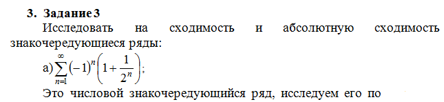 Для студентов ТюмГНГУ по предмету МатематикаЗадание 3. Исследовать на сходимость и абсолютную сходимость знакочередующиеся ряды: (-1)^n*(1+1/2^n)Задание 3. Исследовать на сходимость и абсолютную сходимость знакочередующиеся ряды: (-1)^n*(1+1/2^n)