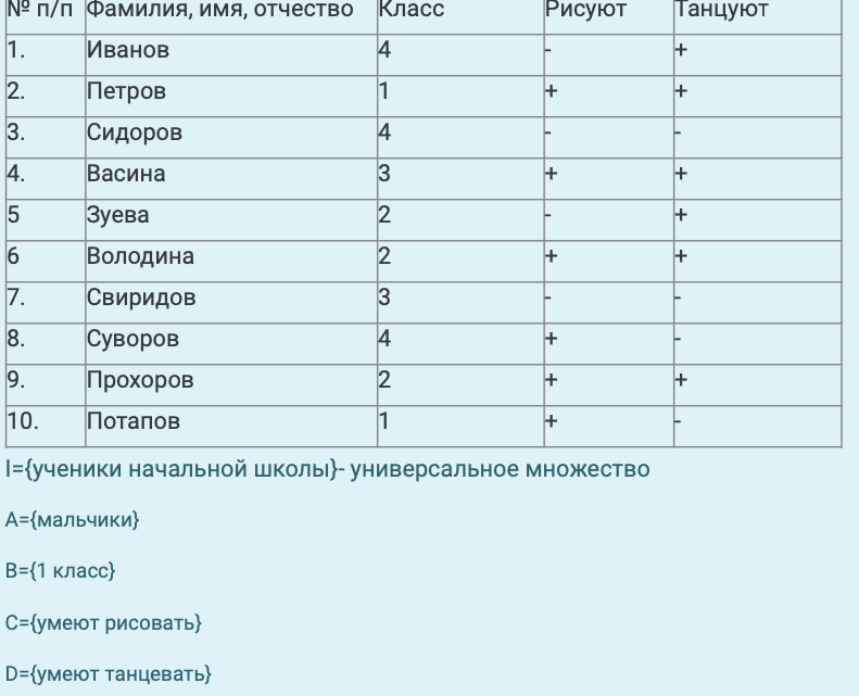 Задание 1. Внимательно посмотрите на таблицу. Расшифруйте формулы и запишите соответствующие номера из таблицы. Далее выберите из выпадающего списка только один правильный ответ. I={ученики начальной школы}- универсальное множество A={мальчики} B={1 класс} C={умеют рисовать} D={умеют танцевать} Задание 2. Выберите к какому множеству чисел относится данное. Можно выбрать только один правильный ответ из выпадающего списка в каждом случае. Обратите внимание на следующее: 2 –в первую очередь, натуральное число, поэтому в списке выбираем его только как натуральное число. Задание 3. Заполните таблицу соответствующими значениями. Из выпадающего списка выберите только один правильный ответ.