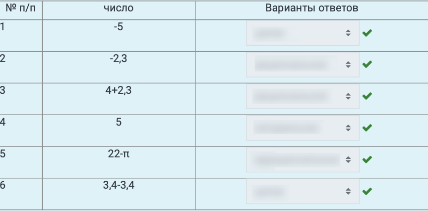 Выберите к какому множеству чисел относится данное. Можно выбрать только один правильный ответ из выпадающего списка в каждом случае. Обратите внимание на следующее: 2 –в первую очередь, натуральное число, поэтому в списке выбираем его только как натуральное число.