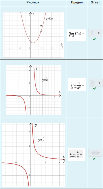 Соотнесите изображения с указанными пределами функции в точке или на бесконечности (выберите из списка один верный ответ). Обратите внимание, что задание содержит фальш-ответы (указаны лишние числовые значения).