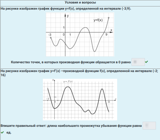 Условия и вопросы: На рисунке изображен график функции y=f(x), определенной на интервале (-3;9) Количество точек, в которых производная функции обращается в 0 равно На рисунке изображен график y=f’(x) –производной функции f(x), определенной на интервале (-2; 16) Впишите правильный ответ: длина наибольшего промежутка убывания функции равна Найдите тангенс угла касательной к графику функции y=f(x) в точке с абсциссой х0 и положительным направлением оси OX. Ответ впишите цифрой, с использованием знака «-» при необходимости .