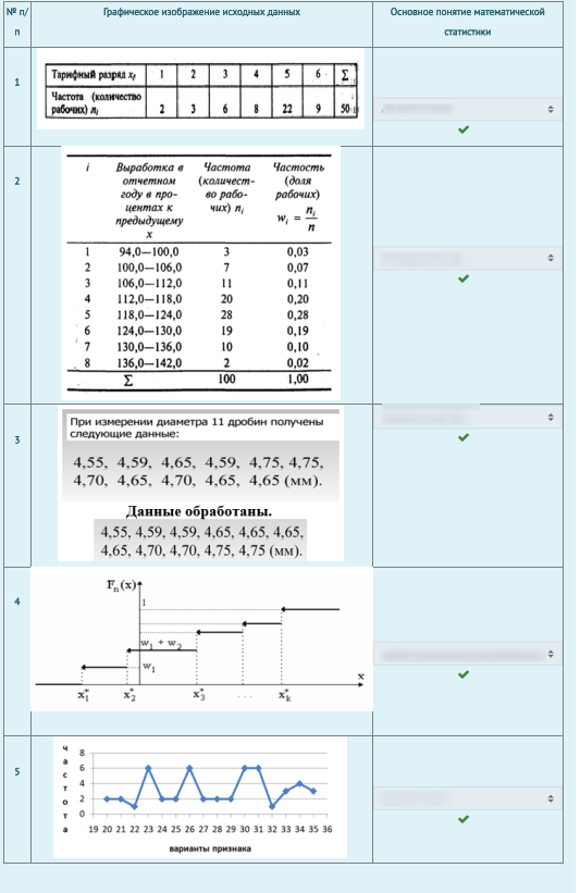 Внимательно изучите графические изображения исходных данных. Соотнесите каждое графическое изображение с основным понятием математической статистики.Далее выберите только один правильный ответ из выпадающего списка. Обратите внимание, что задание содержит фальшответы (представлены неописанные понятия математической статистики). Внимательно прочитайте определения понятий математической статистики и сопоставьте каждое из определений с понятием математической статистики.Далее выберите из выпадающего списка только один правильный ответ. Определения понятий математической статистики: Величина, характеризующая некоторое случайное событие. Один из способов графического представления плотности вероятности случайной величины.
