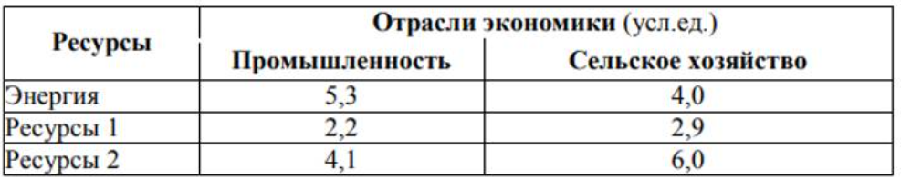 Если дана таблица ресурсов по отраслям экономики (см. ниже), то матрица распределения ресурсов для указанной таблицы будет иметь вид: …