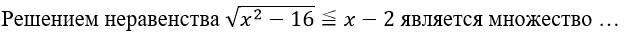 Корнем уравнения 9х — 26 -3х — 27 = 0 является х = ... Корнем уравнения log5(x + 4) + log5 х = 1 является х = ... Неравенство имеет корень х > -3 имеет корень х < -3 имеет корень х < 5 (9/64) не имеет корней Корнем уравнения log3(5 — х) = 2 log3 2 является ... х = 1 1/2 х = -1 х = 1 х = 2 Решением неравенства является множество ... [4;6] [4;5] [5;6] [6;10] Абсолютную величину разности между точным числом x и его приближённым значением а называют абсолютной … Абсолютным значением или … числа n называется число, которое обозначается |n| Абсолютным значением числа -3 является число … В стационарных точках функции производная функции … равна нулю не существует положительна отрицательна Верным является утверждение, что … (укажите 2 варианта ответа) любое целое число является рациональным любое целое число является натуральным нуль – натуральное число нуль – рациональное число Два уравнения называются …, если они имеют одинаковые корни или если оба уравнения не имеют корней Если в некоторой точке производная функции не существует или равна нулю, то это – … точка изгиба критическая точка стационарная точка точка ускорения Если на промежутке (a;b) для функции f(x) выполняется условие f(x)<0, то функция на заданном промежутке … имеет перегиб имеет минимум возрастает убывает Знак первой производной функции показывает … функции характер разрыва четность и нечетность характер монотонности область определения Интервалы знакопостоянства для функции y=3⋅x^2: … (-∞;3) отрицательна (0;3) положительна (-∞;0) отрицательна и (0;+∞) положительна (-∞;3) отрицательна и (3;+∞) положительна Корнем уравнения 6^2x=(1/6)^4 является … x=-4 x=-8 x=4 x=8 Котангенсом угла α (ctgα) называется отношение косинуса угла α к его … Логарифм положительного числа b по основанию 10 называют … логарифмом числа b и обозначают lg b Наибольшим значением функции y=sinx является … 1 -1 0 +∞ Наименьшим значением функции y=cosx является … +∞ -1 0 1 Натуральные числа, число нуль и числа, противоположные натуральным, – это … числа Неверно, что уравнение всегда заменяется на равносильное, если … перенести член уравнения из одной части в другую, изменив его знак на противоположный обе части уравнения умножить на одно и то же число, не равное нулю обе части уравнения возвести в квадрат обе части уравнения разделить на одно и то же число, не равное нулю Неравенство, левая и правая части которого являются дробно-рациональными функциями, то есть функциями, представимыми в виде отношения многочленов Область определения функции y=ctg x: … Ограниченной снизу является функция … Отношение абсолютной погрешности приближённого числа ∆a к значению самого числа x называется … погрешностью δa приближённого числа а Отношение синуса угла α к его косинусу – это … угла α Последовательность (b_n), в которой каждый последующий член можно найти, если предыдущий член умножить на одно и то же число q, называется … прогрессией Производной тригонометрической функцией является … арккосинус тангенс синус арктангенс Промежутки значений аргумента (x), на которых функция сохраняет свой знак, то есть f(x)>0 или f(x)<0, – это промежутки … функции y=f(x) Равенство |x+8|=2 верно … только при x=-10 только при x=-6 при x=-10 и x=-6 Разность между числом x и его приближённым значением a называют … приближенного числа a Рациональное уравнение называется дробным, когда переменная содержится хотя бы в одном из … Решению нераве