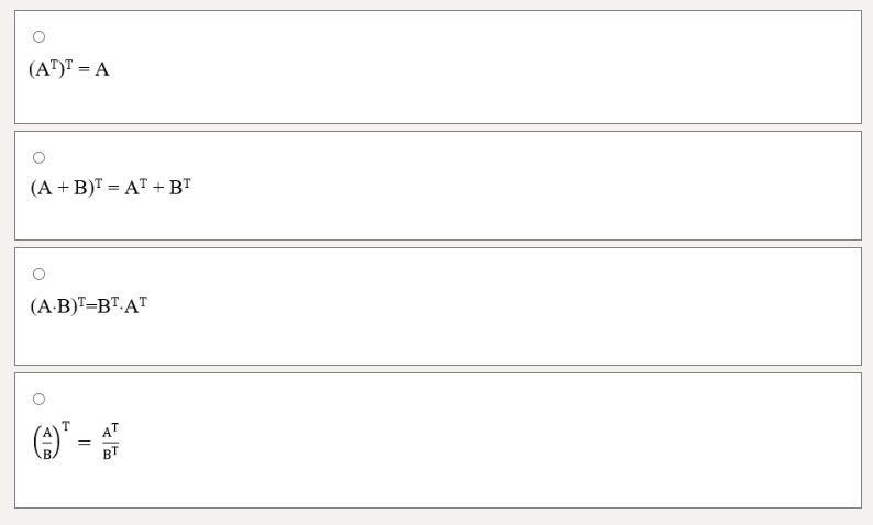 Каким свойством не обладает операция транспонирования матриц?