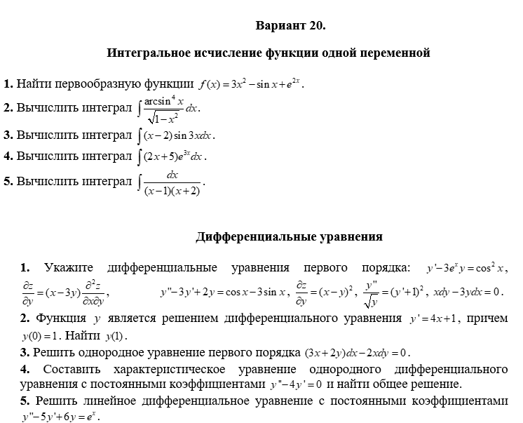 ДЗ: Интегральное исчисление функции одной переменной. Дифференциальные уравнения. Ряды. вариант 20