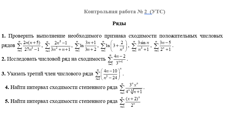 5. Решить линейное дифференциальное уравнение с постоянными коэффициентами . Ряды 1. Проверить выполнение необходимого признака сходимости положительных числовых рядов , , , , , . 2. Исследовать числовой ряд на сходимость . 3. Указать третий член числового ряда . 4. Найти интервал сходимости степенного ряда . 5. Найти интервал сходимости степенного ряда.