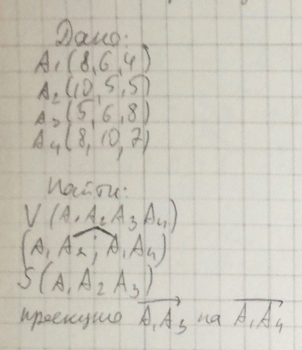 Даны координаты вершин пирамиды А1А2А3А4. Средствами векторной алгебры найдите угол между ребрами А1А2 и А1А4, площадь грани А1А2А3, проекцию вектора А1А3 на вектор А1А4, объем пирамиды