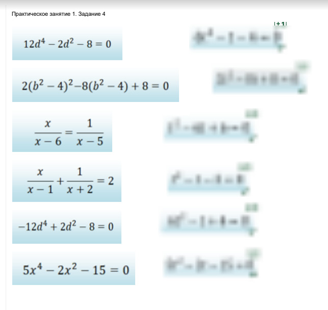 Сопоставьте квадратные уравнения и те, которые к ним сводятся при решении. Перетащите нужный вариант квадратного уравнения на уравнение другого вида, зажав левую кнопку мыши. 12d4-2d2-8=0 2(b2-4)2-8(b2-4)+8=0 x/x-6=1/x-5 x/x-1+1/x+2=2 -12d4+2d2-8=0 5х4-2x2-15=0.