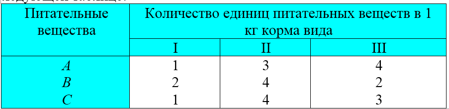 Указанные питательные вещества содержат три вида корма. Содержание единиц питательных веществ в 1 кг каждого из видов корма приведено в следующей таблице: