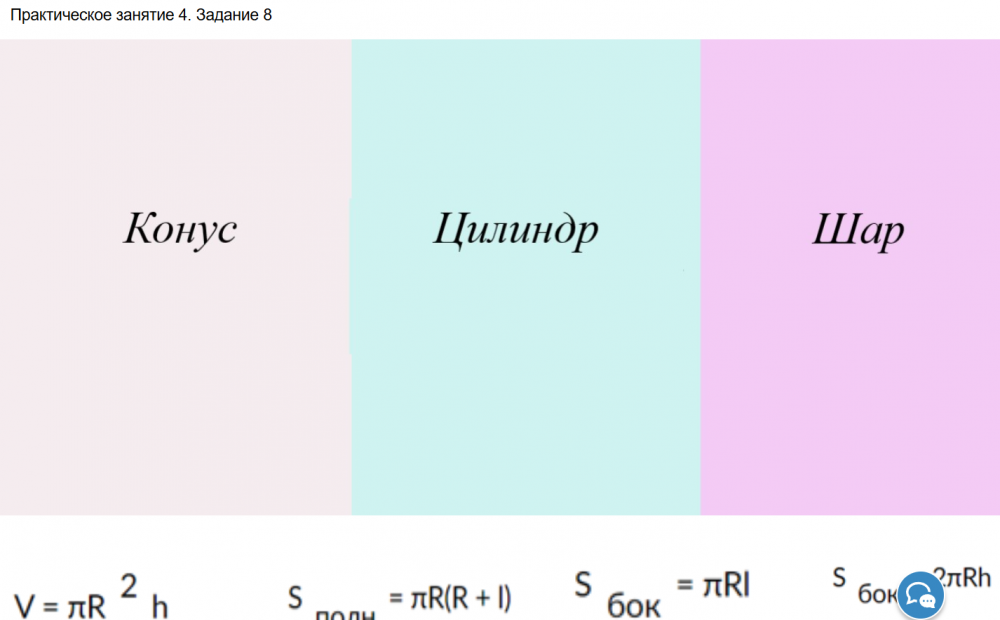 Рассмотрите формулы. Определите, какие из них относятся к цилиндру, конусу и шару. Переместите их в соответствующие поля, зажав левую кнопку компьютерной мыши. Обратите внимание, среди предложенных вариантов присутствуют лишние формулы.