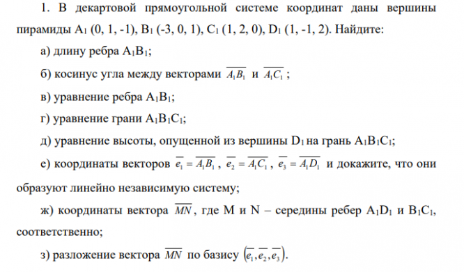 В декартовой прямоугольной системе координат даны вершины пирамиды A1 (0, 1, -1), B1 (-3, 0, 1), C1 (1, 2, 0), D1 (1, -1, 2). Найдите: