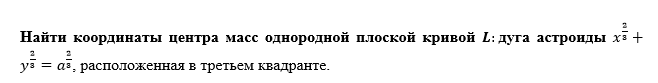Найти координаты центра масс однородной плоской кривой дуга астроиды , расположенная в третьем квадранте.