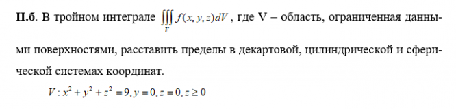 Для студентов по предмету МатематикаВ тройном интеграле , где V – область, ограниченная данными поверхностями, расставить пределы в декартовой, цилиндрической и сфери-ческой системах коВ тройном интеграле , где V – область, ограниченная данными поверхностями, расставить пределы в декартовой, цилиндрической и сфери-ческой системах ко