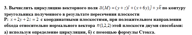 Вычислить циркуляцию векторного поля по контуру треугольника полученного в результате пересечения плоскости