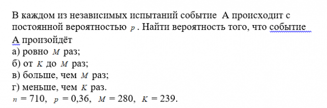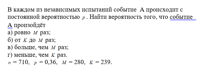 Главная » Учебные материалы » Математика » Решения задач » В каждом из независимых испытаний событие А происходит с постоянной вероятностью