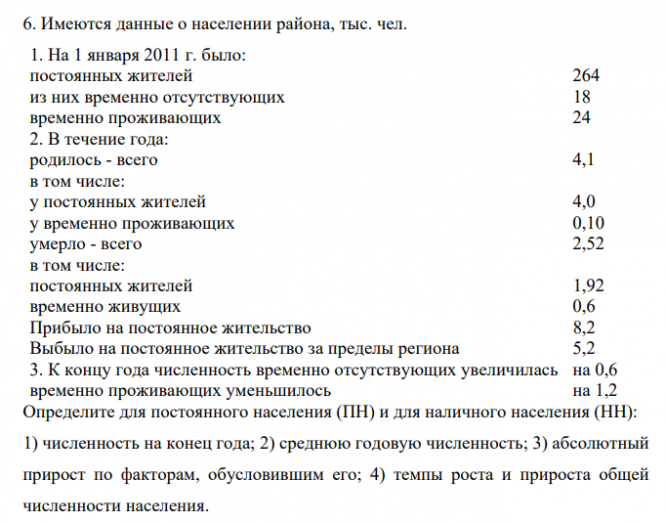 Имеются данные о населении района, тыс. чел. 1. На 1 января 2011 г. было: постоянных жителей 264 из них временно отсутствующих 18 временно проживающих 24 2. В течение года: родилось - всего 4,1 в том числе: у постоянных жителей 4,0 у временно проживающих 0,10 умерло - всего 2,52 в том числе: постоянных жителей 1,92 временно живущих 0,6 Прибыло на постоянное жительство 8,2 Выбыло на постоянное жительство за пределы региона 5,2 3. К концу года численность временно отсутствующих увеличилась на 0,6 временно проживающих уменьшилось на 1,2 Определите для постоянного населения (ПН) и для наличного населения (НН): 1) численность на конец года; 2) среднюю годовую численность; 3) абсолютный прирост по факторам, обусловившим его; 4) темпы роста и прироста общей численности населения.