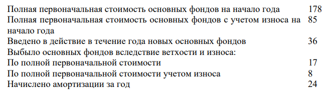 Имеются условные данные по одному из регионов России (млрд. руб.): Полная первоначальная стоимость основных фондов на начало года 178 Полная первоначальная стоимость основных фондов с учетом износа на начало года 85 Введено в действие в течение года новых основных фондов 36 Выбыло основных фондов вследствие ветхости и износа: По полной первоначальной стоимости 17 По полной первоначальной стоимости учетом износа 8 Начислено амортизации за год 24 Определите: 1) Стоимость основных фондов на конец года по полной первоначальной стоимости и по стоимости за вычетом износа; 2) Показатели годности и износа фондов на начало года и конец года; 3) Показатели обновления и выбытия основных фондов.