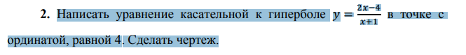 Написать уравнение касательной к гиперболе 𝑦 = 2𝑥−4 𝑥+1 в точке с ординатой, равной 4. Сделать чертеж.