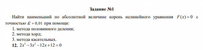 Найти наименьший по абсолютной величине корень нелинейного уравнения F x( ) 0  с точностью   0,01 при помощи: 1. метода половинного деления; 2. метода хорд; 3. метода касательных