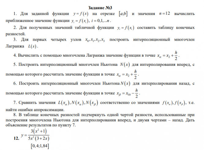 6. Построить интерполяционный многочлен Ньютона N x  для интерполирования назад, с помощью которого рассчитать значение функции в точке 10 2 h x x    . 7. Сравнить значения L x N x N x     , ,     соответственно со значениями f x f x    ,   , т.е. найти ошибки аппроксимации.