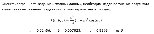 Главная » Учебные материалы » Математика » Решения задач » 3 семестр » Оценить погрешность задания исходных данных, необходимых для получения результата вычисления выражения с заданным числом верных значащих цифр.