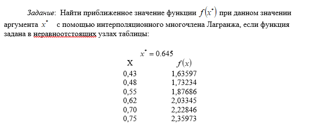 Найти приближенное значение функции при данном значении аргумента с помощью интерполяционного многочлена Лагранжа, если функция задана в неравноотстоящих узлах таблицы