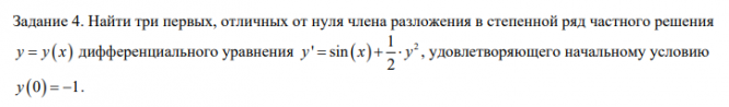 Найти три первых, отличных от нуля члена разложения в степенной ряд частного решения дифференциального уравнения, удовлетворяющего начальному условию