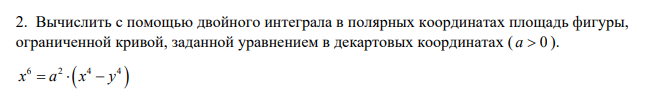 Для студентов по предмету МатематикаВычислить с помощью двойного интеграла в полярных координатах площадь фигуры, ограниченной кривой, заданной уравнением в декартовых координатахВычислить с помощью двойного интеграла в полярных координатах площадь фигуры, ограниченной кривой, заданной уравнением в декартовых координатах