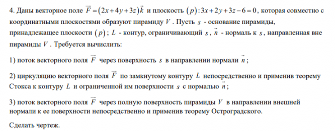 Даны векторное поле F и плоскость, которая совместно с координатными плоскостями образуют пирамиду V . Пусть s - основание пирамиды, принадлежащее плоскости ; L - контур, ограничивающий s, n - нормаль к s , направленная вне пирамиды V .