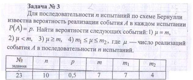 Для последовательности и испытаний по схеме Бернулли известна вероятность реализации события А в каждом испытании P(A) = р. Найти вероятности следующих событий: 1) y = m, 2) y < m, 3) p ≥ m, 4) m ≤ p1 ≤ m, где и — число реализаций события А в последовательности п испытаний.